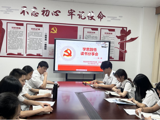 读书会上,熊老师带领同学们认真研读《教材》第一节,进一步了解中国共产党的性质、最高理想、根本宗旨和初心使命。党员们现场积极参与讨论,发表感悟。李玲茜同学谈到:作为一名学生党员,我们要在工作中自觉践行群众路线,端正思想态度,加强自身作风建设。树高远之志,夯成才之基,谱青春之歌,以“勤学善思,厚德求新”的校训精神走好人生的每一步路。随后,支部成员相继结合自身实际就自己的选读章节谈体悟、对校训精神的理解述感想。讨论气氛热烈,大家相互学习交流。大家纷纷表示校训精神激励着每个广航人不忘初心,锐意进取,并表示一定要持续深入学习贯彻习近平新时代中国特色社会主义思想,养成爱读书的良好习惯。