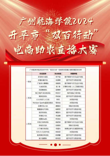 以2024开平市“双百行动”电商助农直播大赛为抓手,学校广泛发动、积极组织,累计64支队伍、400余名师生投身电商直播,自11月9日起,排名前十的团队进一步挺进决赛,竞逐直播助农巅峰对决。