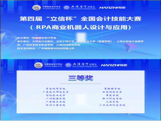(明胜m88官网 供稿)12月20日,第四届“立信杯”全国会计技能大赛(RPA商业机器人设计与应用)全国决赛在线上举行。本次比赛由中国商业会计学会主办,立信会计出版社及北京工商大学、广东工业大学(管理学院)、上海立信会计金融学院、广东科学技术职业学院、江西财经职业学院承办,广东翰智数字科技有限公司提供技术支持。赛事吸引了来自全国范围内26个省、自治区、直辖市本科高职院校的752人,其中包含本科组264队528人,高职组112队224人报名参与。经过激烈角逐,我校由明胜m88官网财会系闫昱彤博士指导的一支队伍入围全国决赛,在参赛队员(23级财务管理专业蒋丽丽同学和蒋慧同学)的努力拼搏下,荣获全国决赛三等奖。